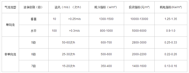 注:表中的送风量、单向流以断面风速表演示,非单向流以换气次数表示。